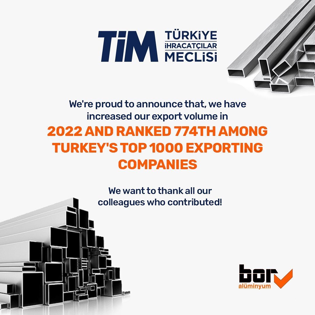 It is with great pride that we announce a remarkable achievement for Bor Alüminyum. In 2022, our commitment to excellence and dedicated efforts have resulted in a significant increase in our export volume, earning us the prestigious 774th position among Turkey’s top 1000 exporting companies. This achievement is a tribute to the hard work, loyalty